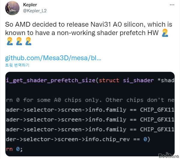 이번 정보는 AMD의 Mesa 드라이버에 GFX1100(Navi31), GFX1102(Navi32), GFX1103(Navi33) 칩의 A0 리비전에서 셰이더 프리페치를 비활성화하는 코드가 발견된 것으로, 보통 A0은 동작 실증을 위한 첫 테이프아웃 칩을 비릇한 초기 설계 칩을 뜻하며, 라데온 RX 7900 XTX 바이오스에서 A0 리비전 칩이 사용 중인 것도 확인된 바 있다.